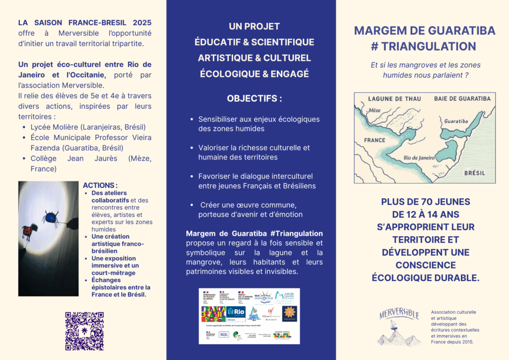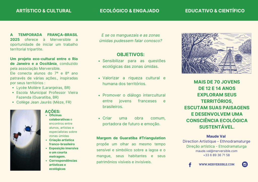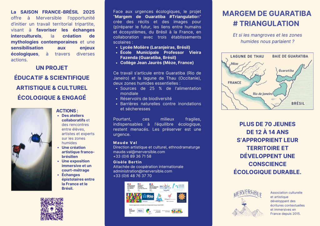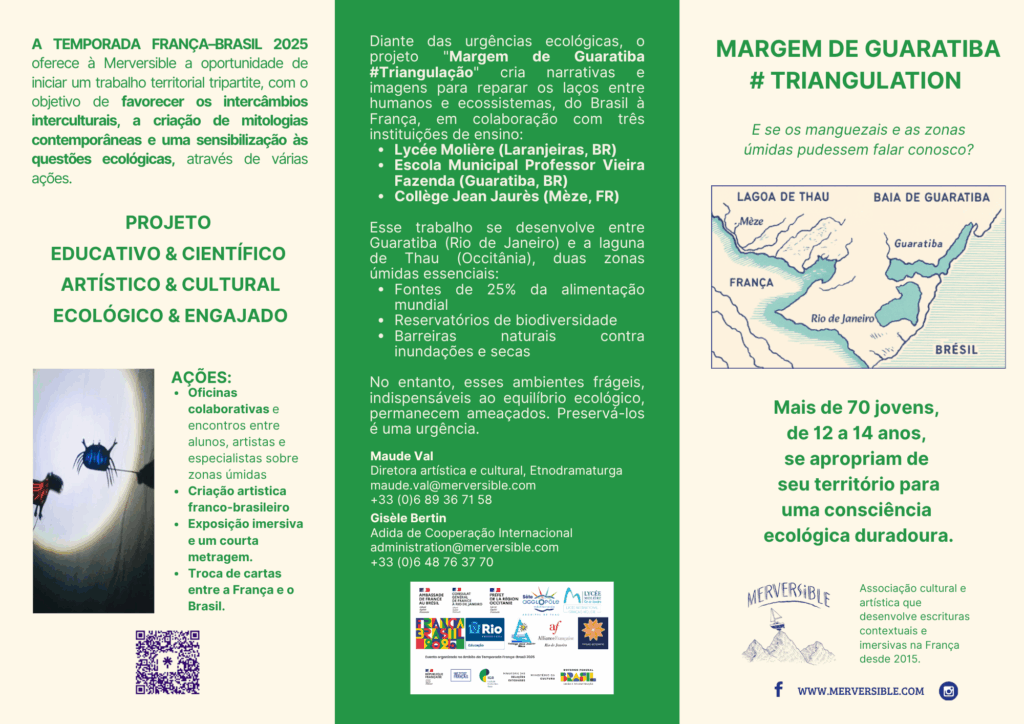 Margem de Guaratiba #Triangulation est un projet artistique et culturel de territoire porté par Merversible, en partenariat avec des acteurs locaux et internationaux. Ce projet propose une écriture in situ pour (ré)parer le futur en réponse aux urgences écologiques. Il s’agit d’un travail collaboratif mené sur les berges de Guaratiba (Brésil), en résonance avec le projet au long cours de Merversible autour de la lagune de Thau (Occitanie, France).
