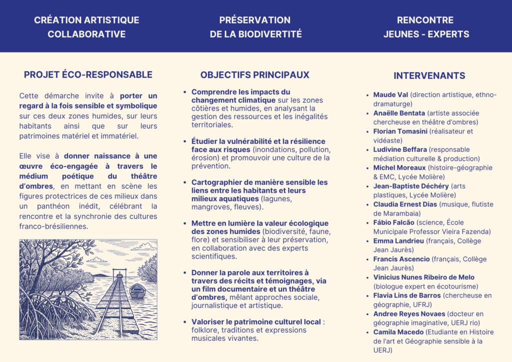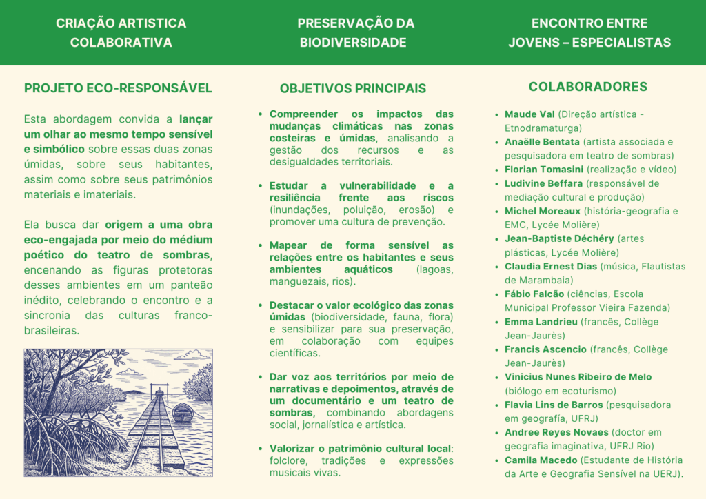 Margem de Guaratiba #Triangulation est un projet ambitieux qui vise à créer des liens entre les habitants et leur environnement fluvial, en utilisant l’art et la science pour explorer et documenter ces relations. Il s’inscrit dans une démarche de coopération internationale visant à favoriser les échanges interculturels et la création de mythologies contemporaines centrées sur la protection des lagunes et des écosystèmes fluviaux.